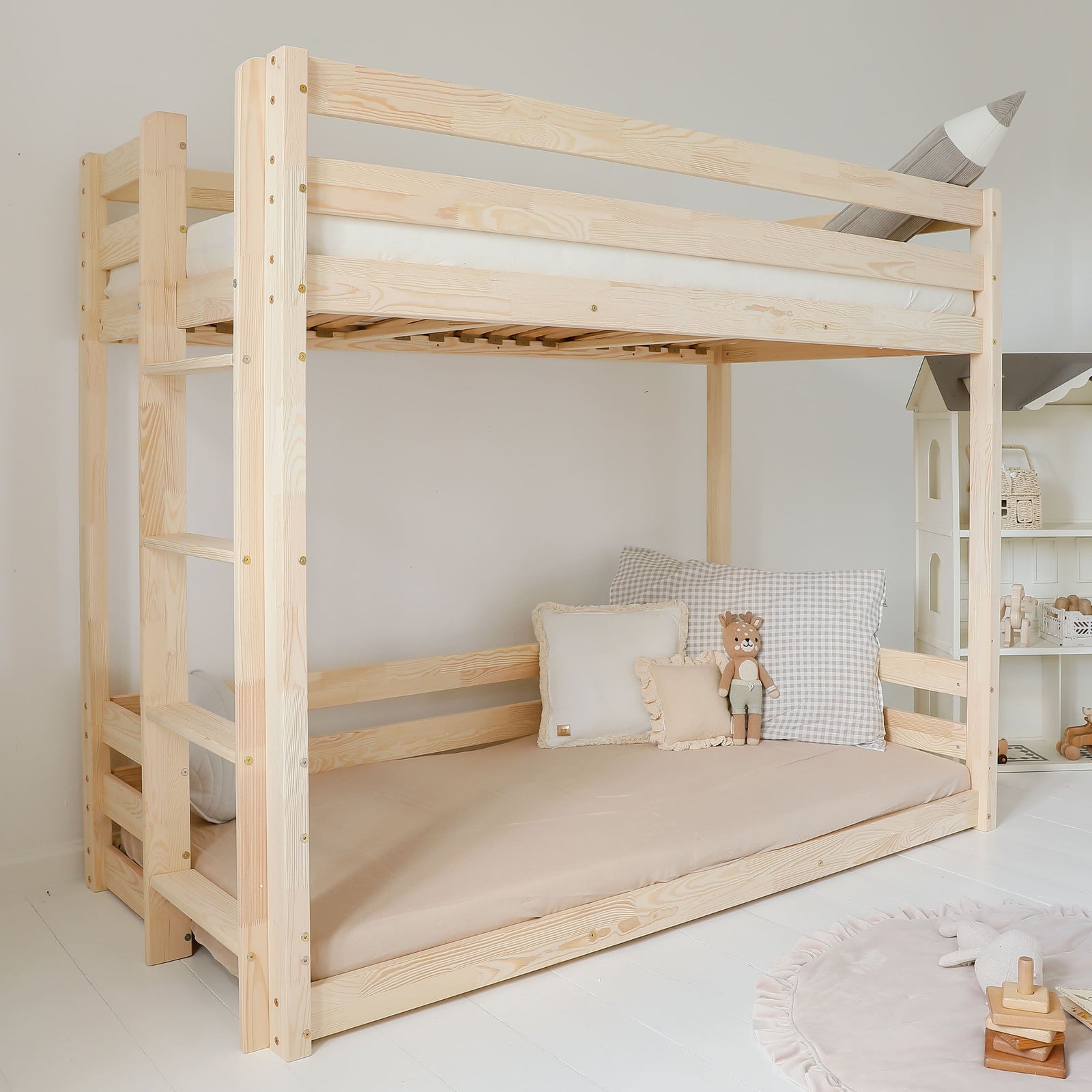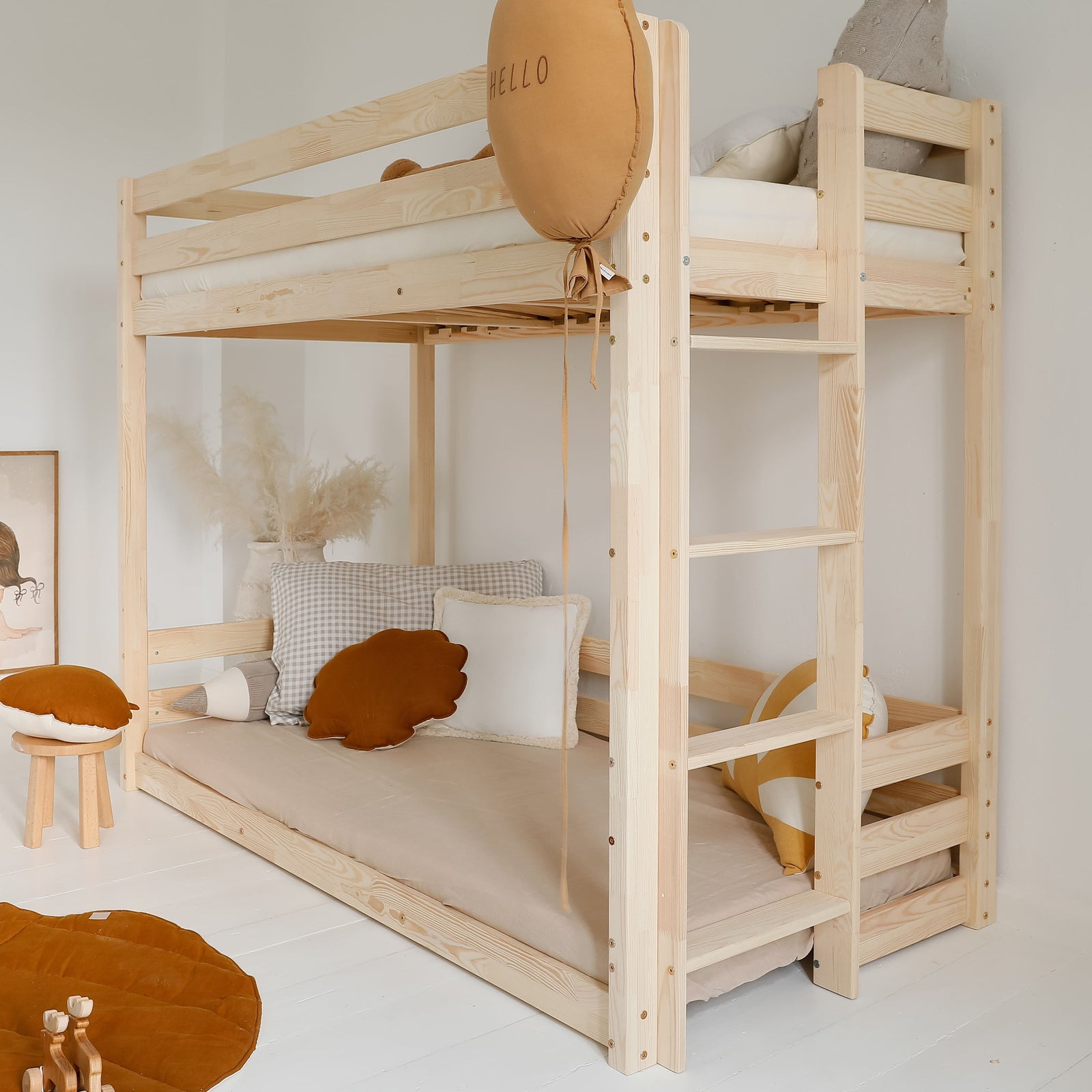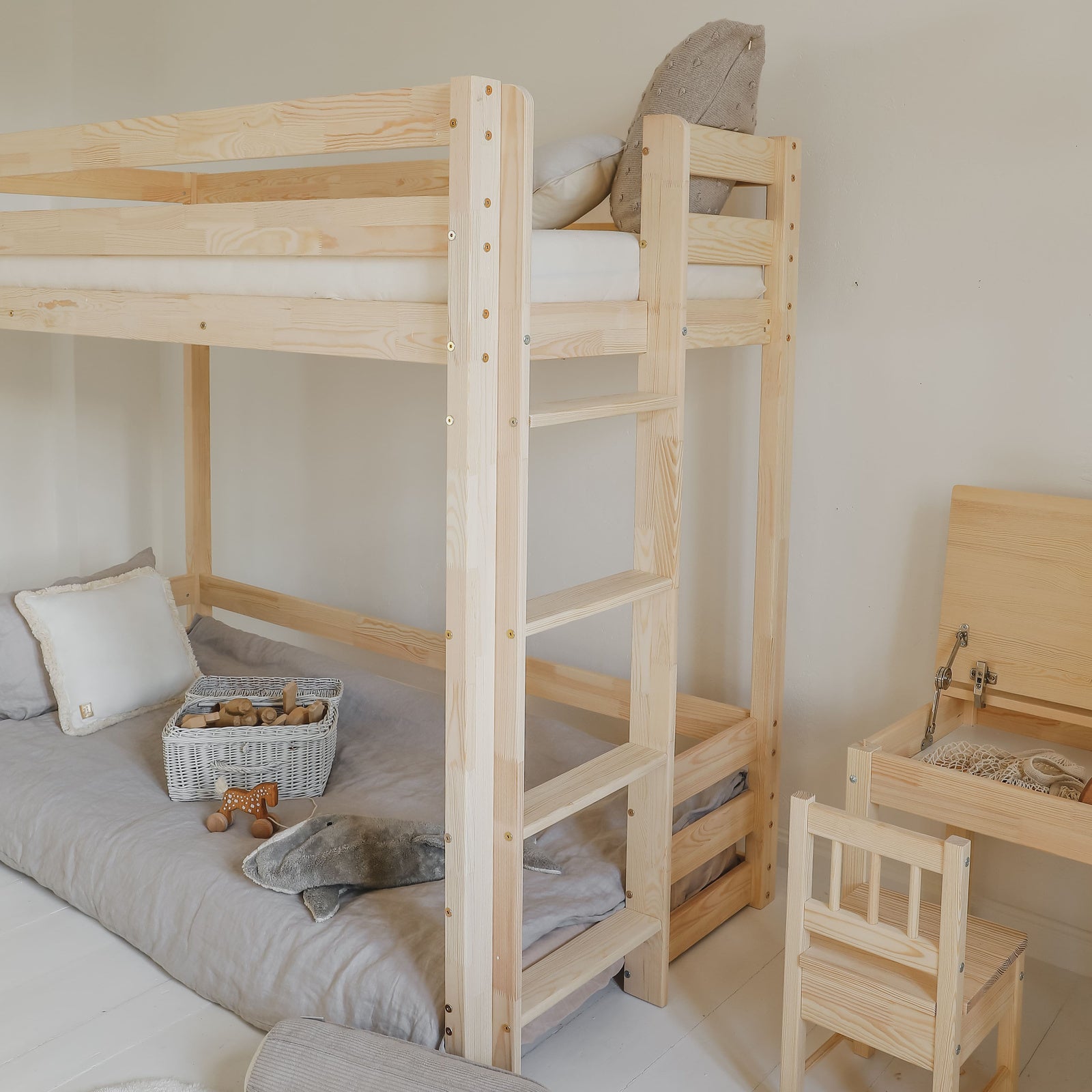 Køjeseng – Skab et hyggeligt og trygt sovested til to børn med denne smukke køjeseng i husdesign. Lavet af massivt, ubehandlet fyrretræ og udstyret med stakitbarriere og fleksibel stigeplacering. Perfekt til både søskende og overnattende gæster. Sengen kombinerer leg, funktion og nordisk æstetik i ét pladsbesparende møbel.