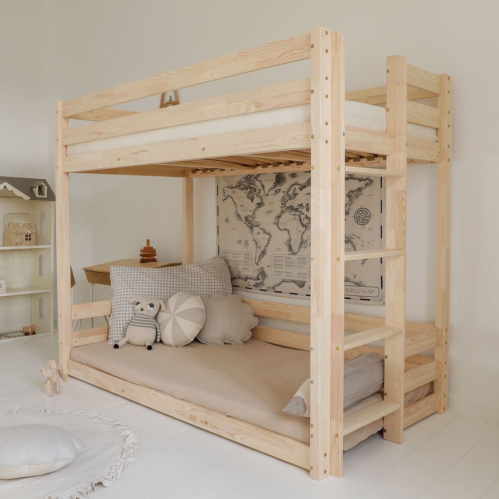 Er sengen sikker for mindre børn? Ja. Den er lavet med robuste materialer, højt stakitværk og solide lameller. Den øverste etage er beregnet til børn fra 6 år. Max. belastning: øverste etage 60 kg, nederste etage 100 kg.