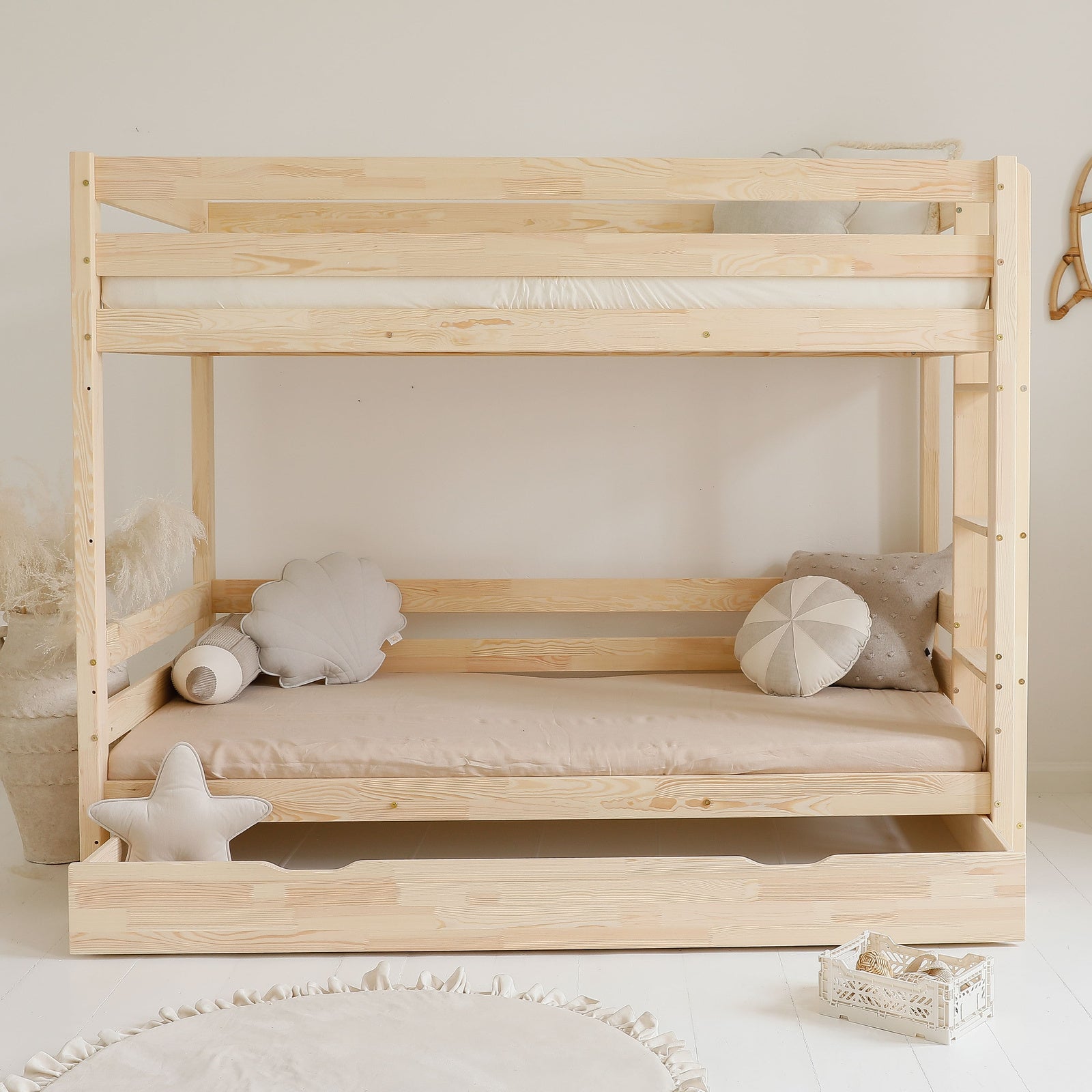 Køjeseng m. skuffe - Naturligt træ Skab et hyggeligt og trygt sovested til to børn med denne smukke køjeseng i husdesign. Lavet af massivt, ubehandlet fyrretræ og udstyret med stakitbarriere og fleksibel stigeplacering. Perfekt til både søskende og overnattende gæster. Sengen kombinerer leg, funktion og nordisk æstetik i ét pladsbesparende møbel.