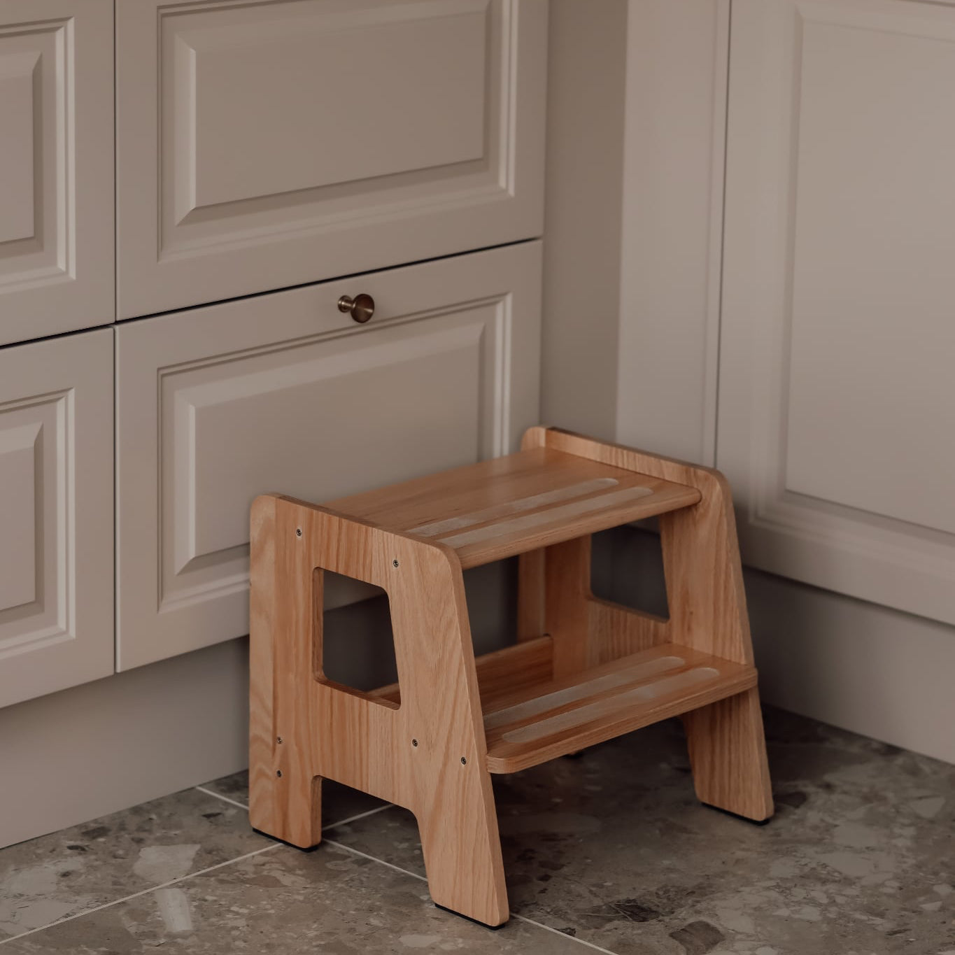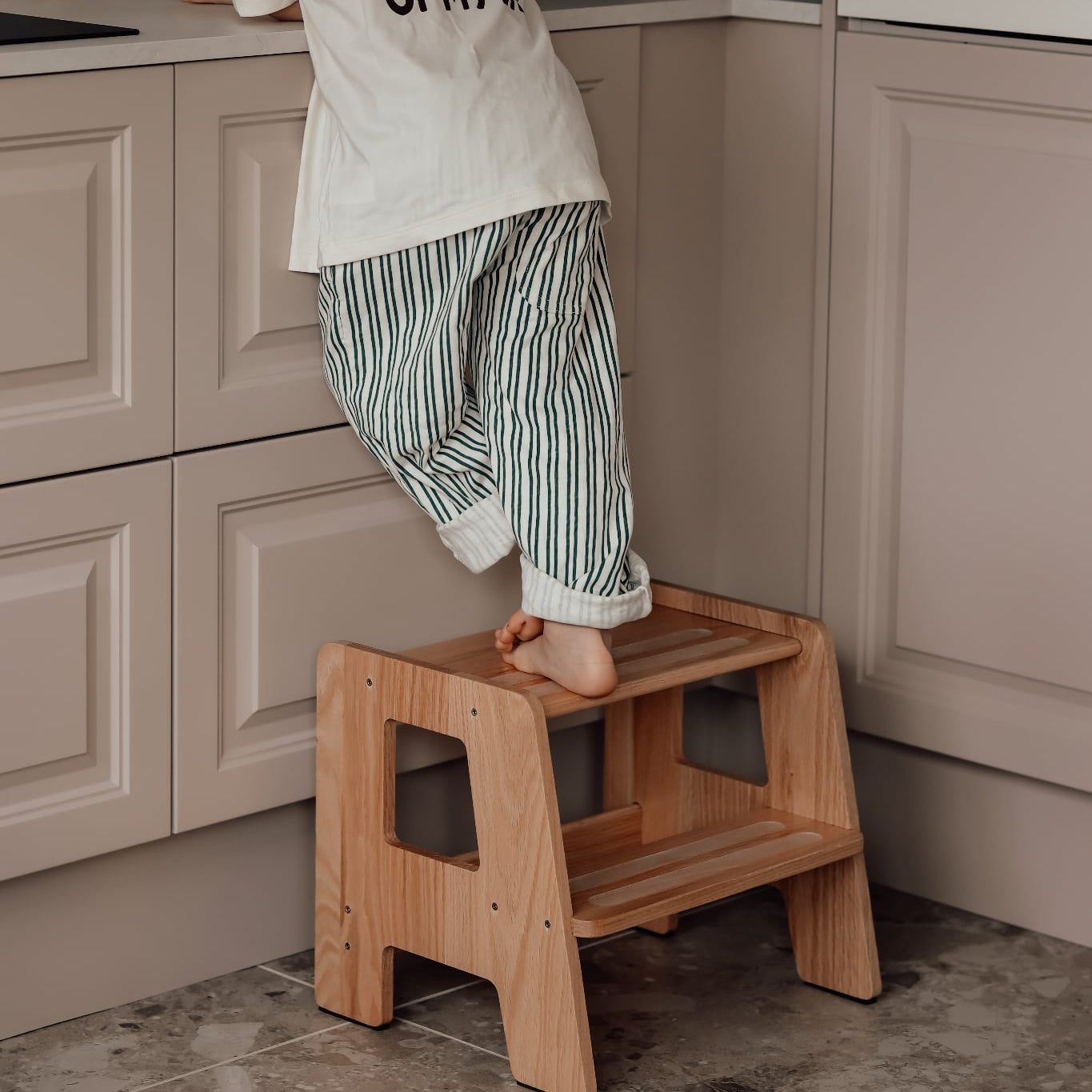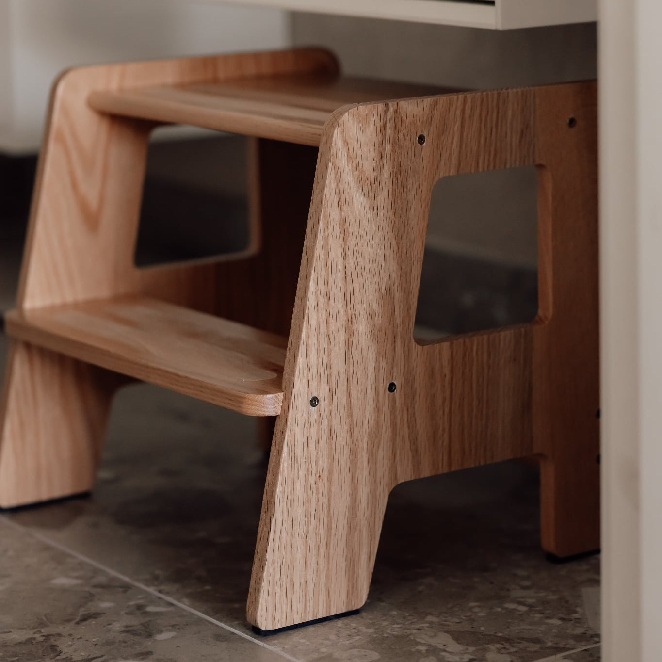 Denne smukke børneskammel i massivt egetræ er designet til at give barnet en tryg og stabil højde i hverdagen – uanset om det er ved håndvasken, køkkenbordet eller som ekstra siddeplads på børneværelset.