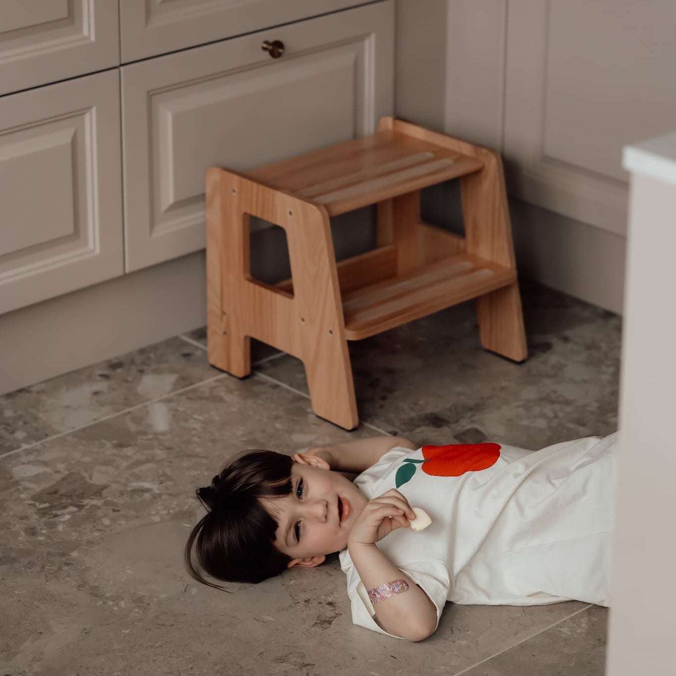 Den brede top og det stabile trindesign giver barnet et sikkert fodfæste og gør det nemt at komme op og ned selv. De afrundede kanter og den solide konstruktion sikrer både komfort og sikkerhed i daglig brug.