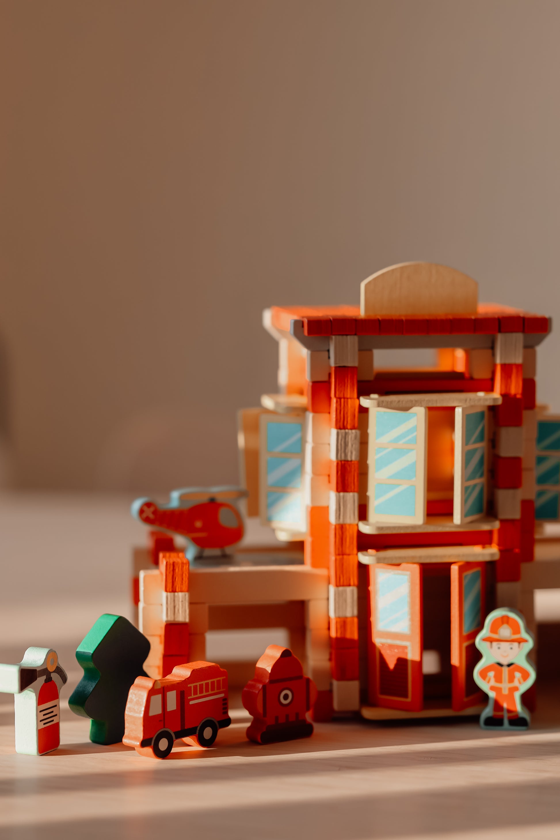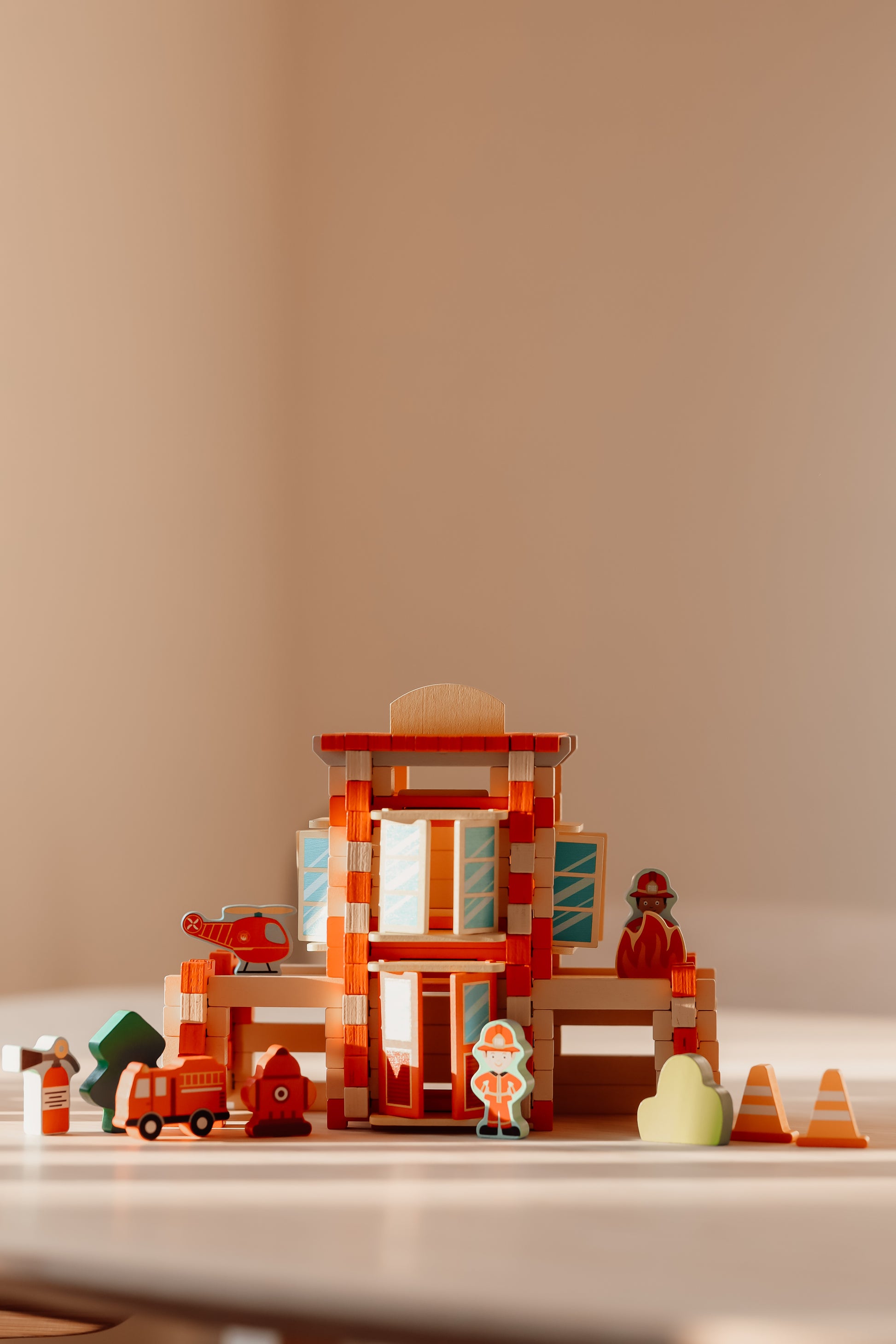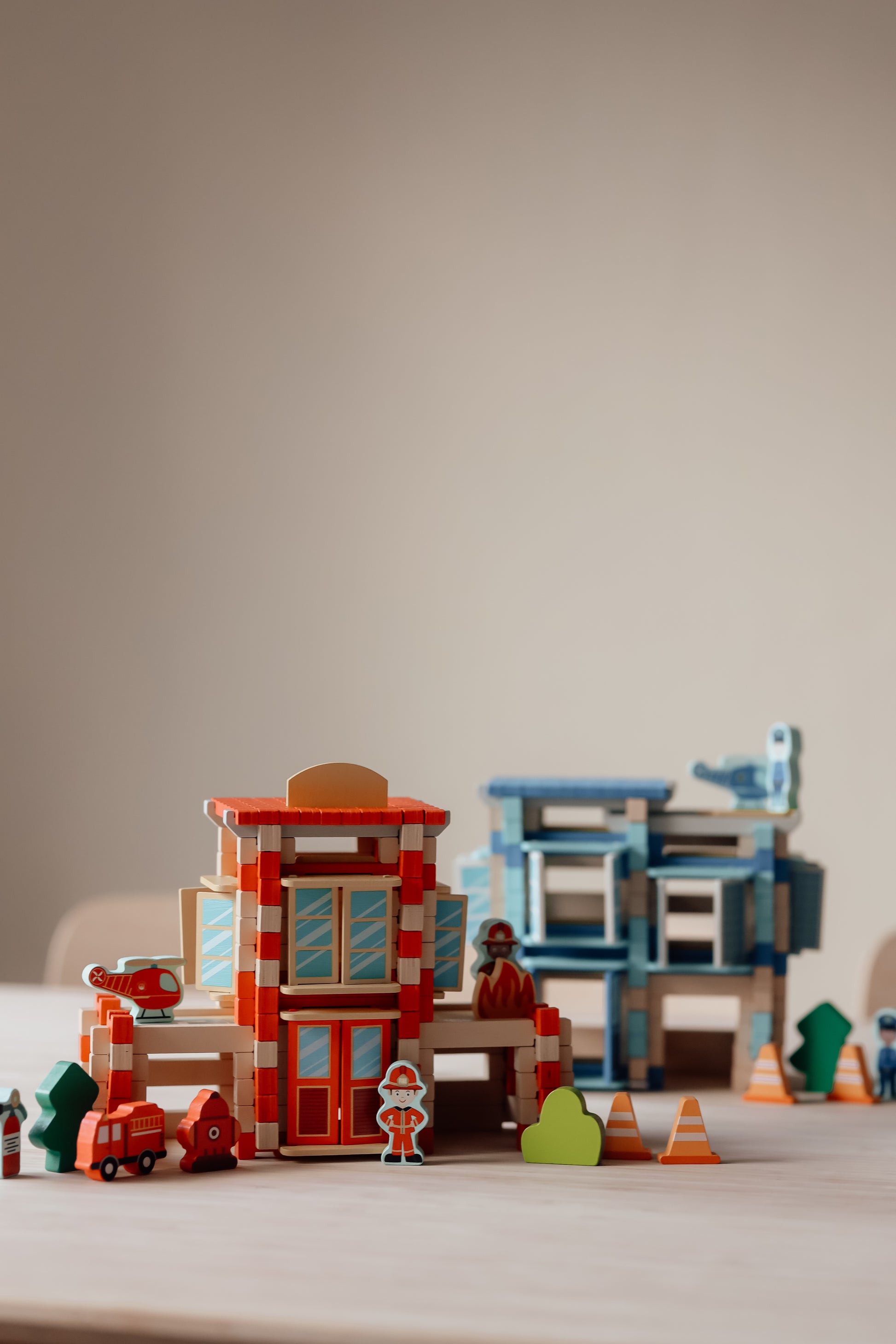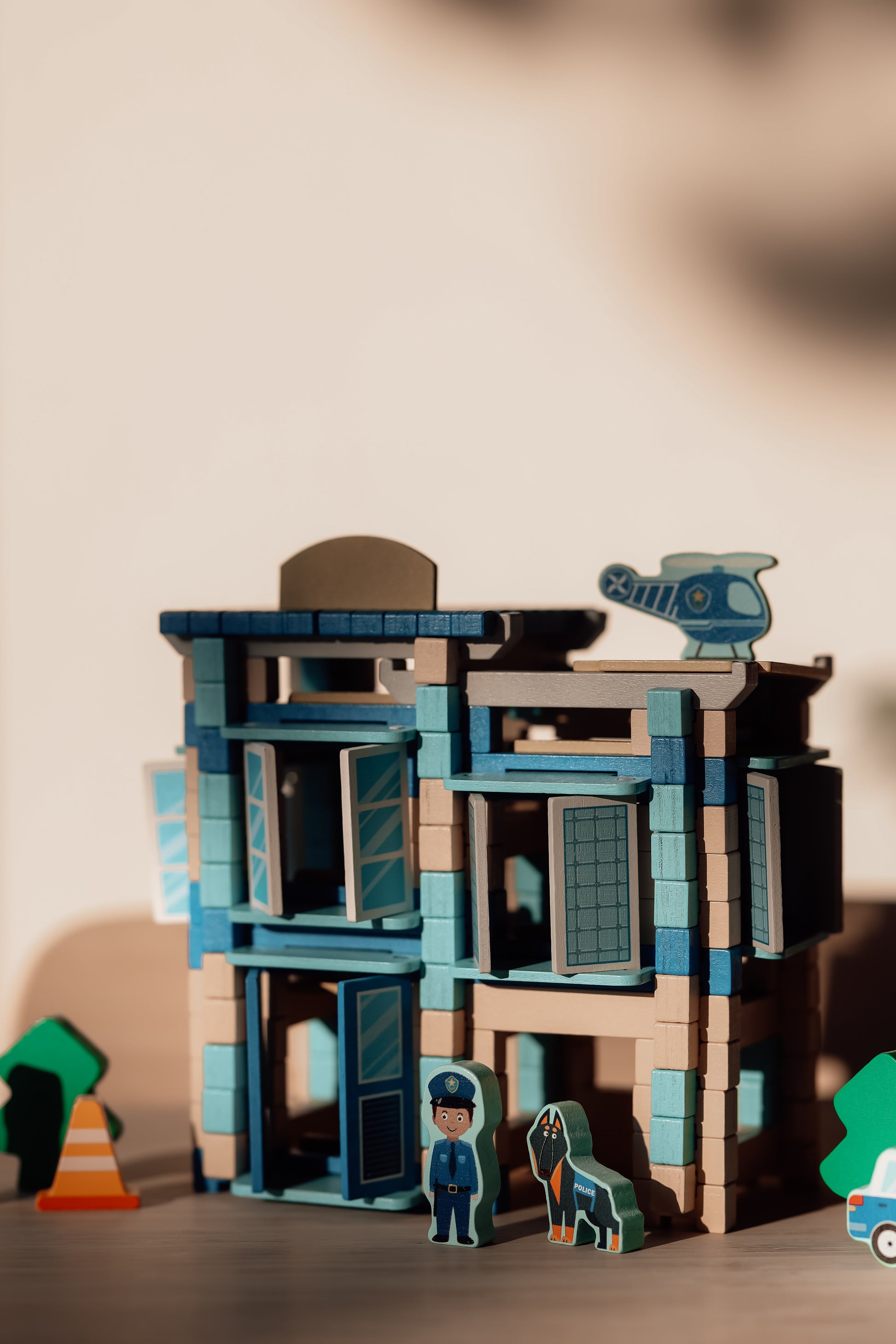 Byg din egen verden med vores byggeklodser i træ! Vælg mellem forskellige temaer; politistation, brandstation, hospital, ZOO, bondegård eller skole – hvert sæt indeholder farverige klodser og figurer, der gør legen levende og fantasifuld. Perfekt til kreativ leg og fordybelse for børn fra 3 år.