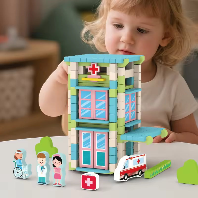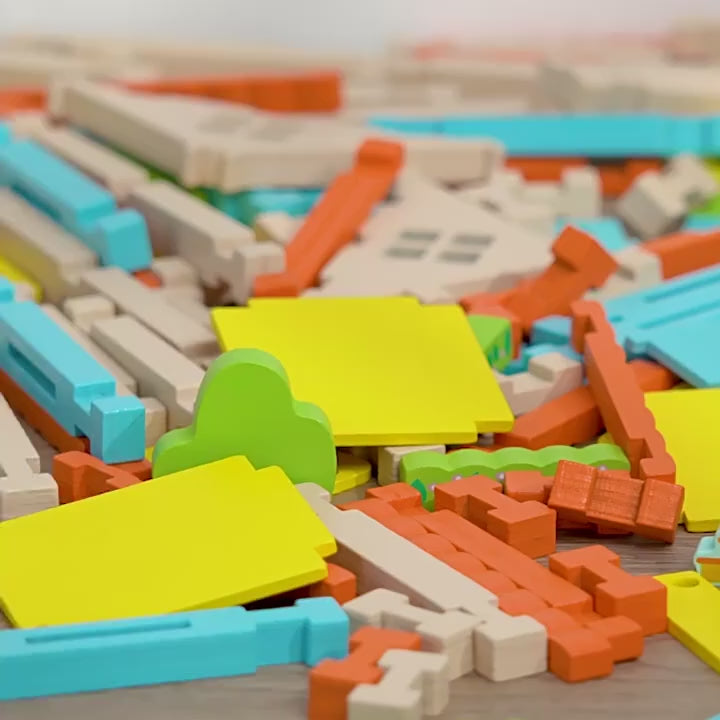 Med dette kreative byggesæt i træ kan børnene forvandle rummet til deres helt egen lille by. Klodserne er fremstillet i naturligt træ, slebet glatte og farvet med giftfri maling. De forskellige temaer giver børn mulighed for at lege rollelege, opfinde historier og udvikle både fantasi og motorik.