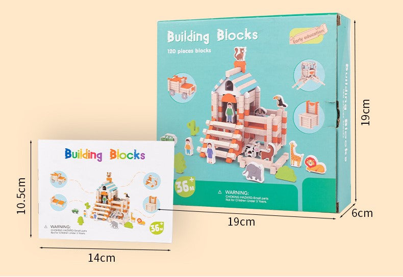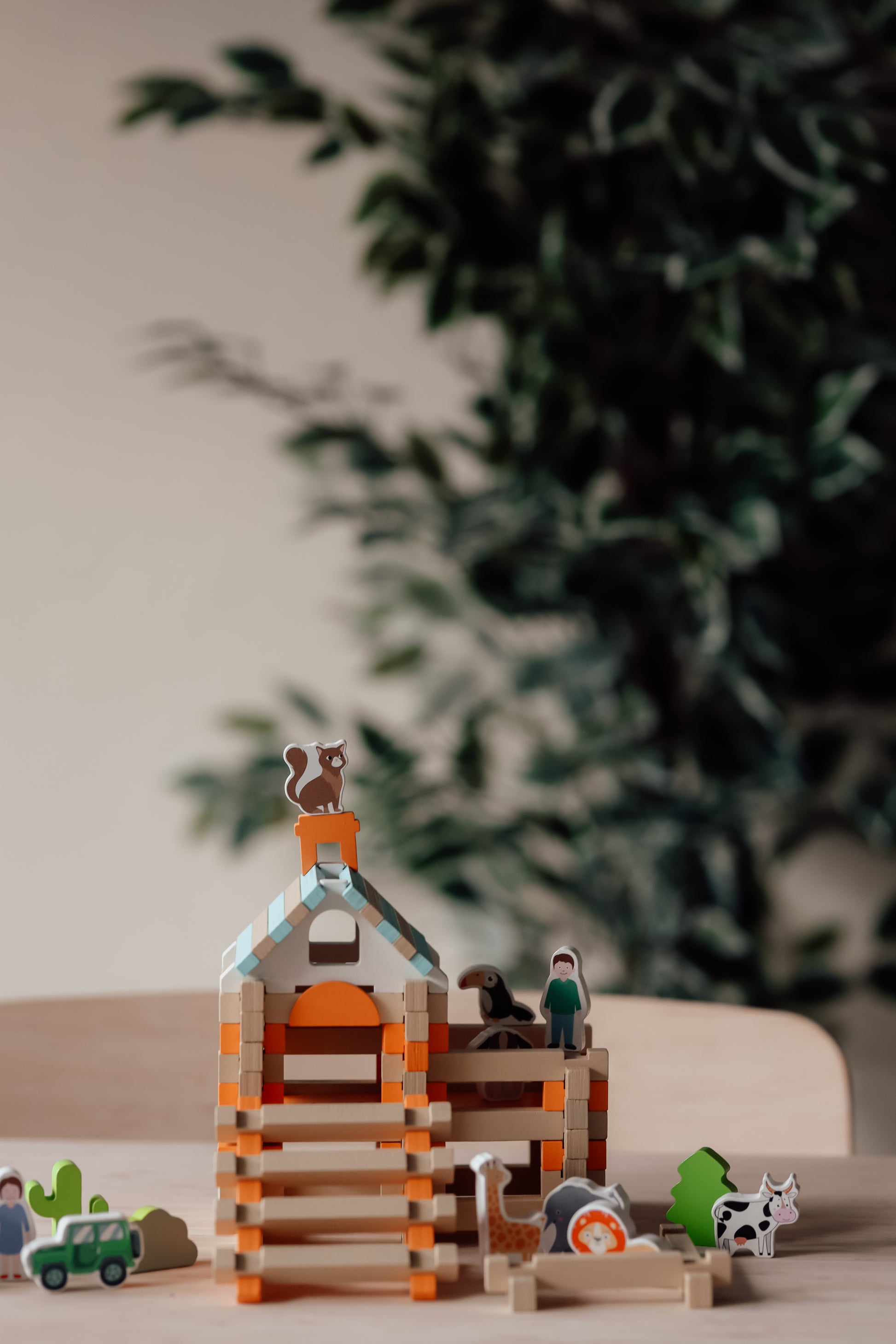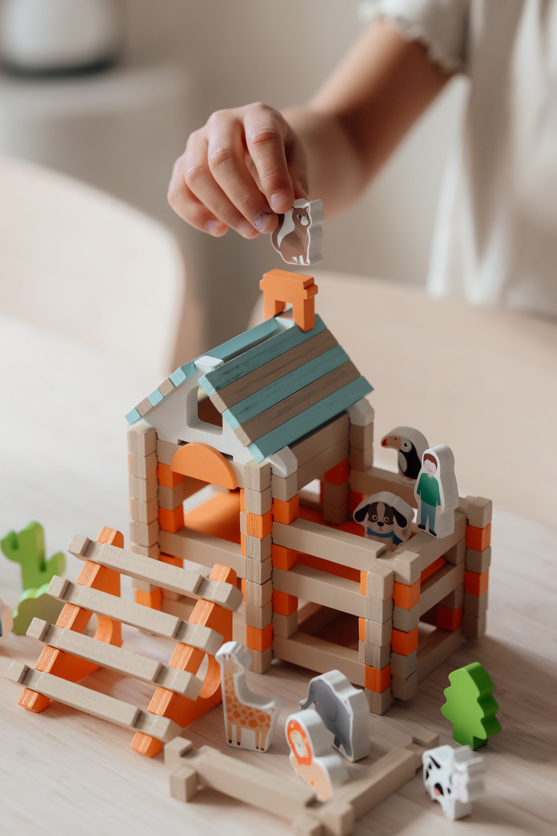 🟧 Sæt C – Hotel: Indeholder 120 klodser og tematiske figurer, så børn kan bygge et detaljeret hjem eller gård med masser af legemuligheder.