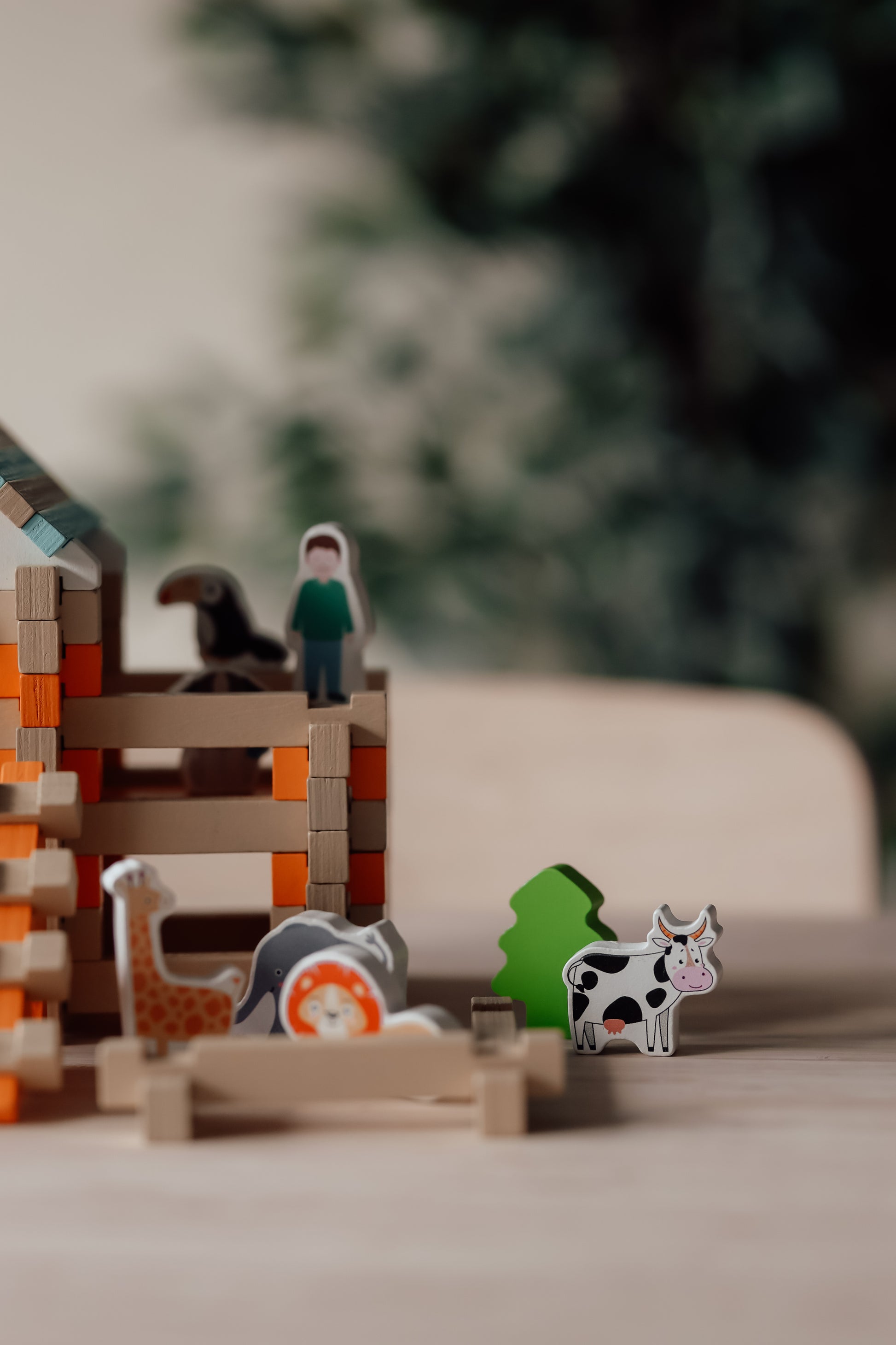 🟦 Sæt A – Klassisk husbyg/bro: Indeholder 114 træklodser + figurer/detaljer (fx dyr, mennesker, biler og træer).