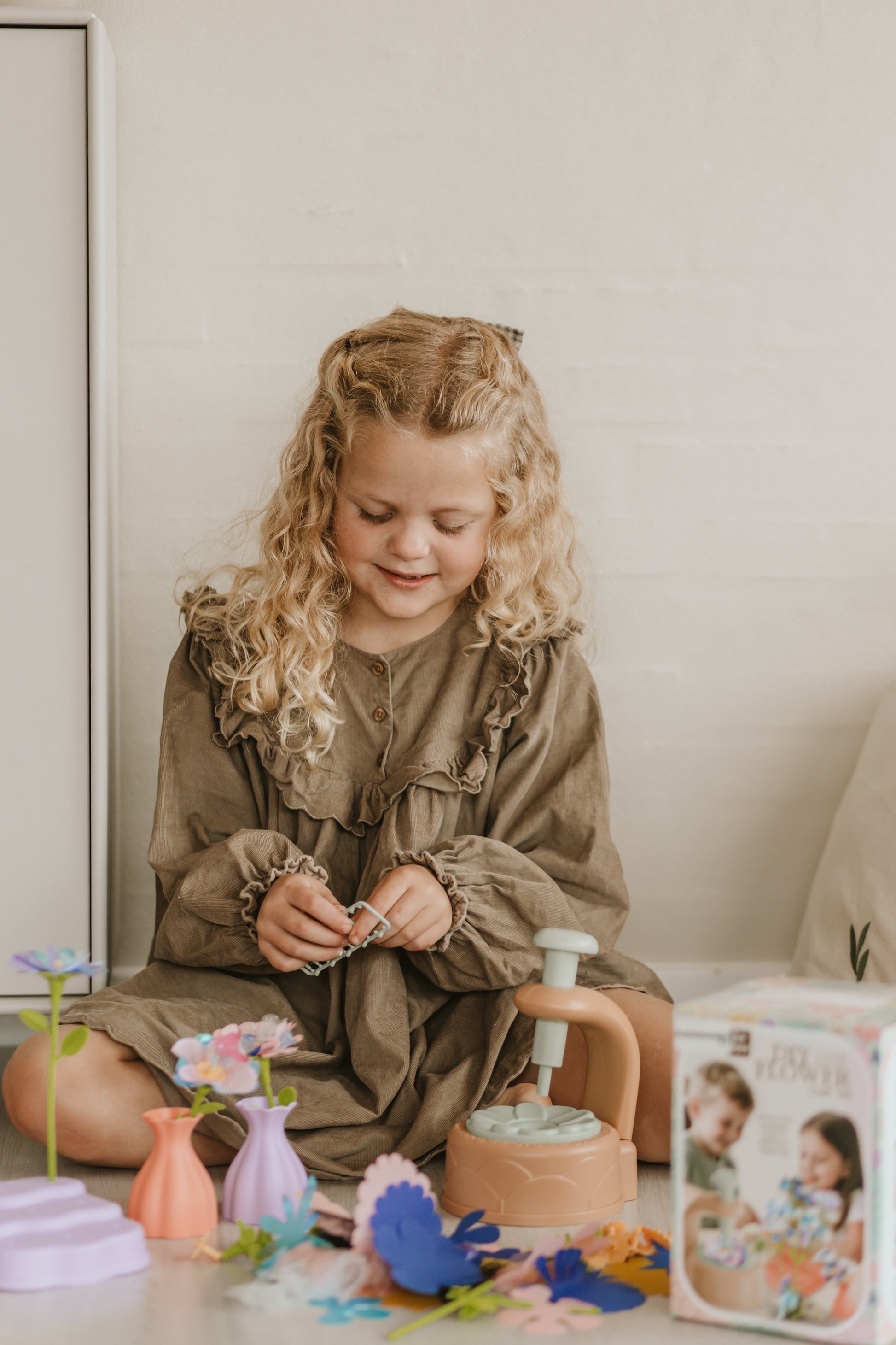 Et tryk på blomsterpressen, og magien sker – blomsterne formes og samles nemt, så barnet kan designe, bygge og udstille sine egne blomsterkreationer.