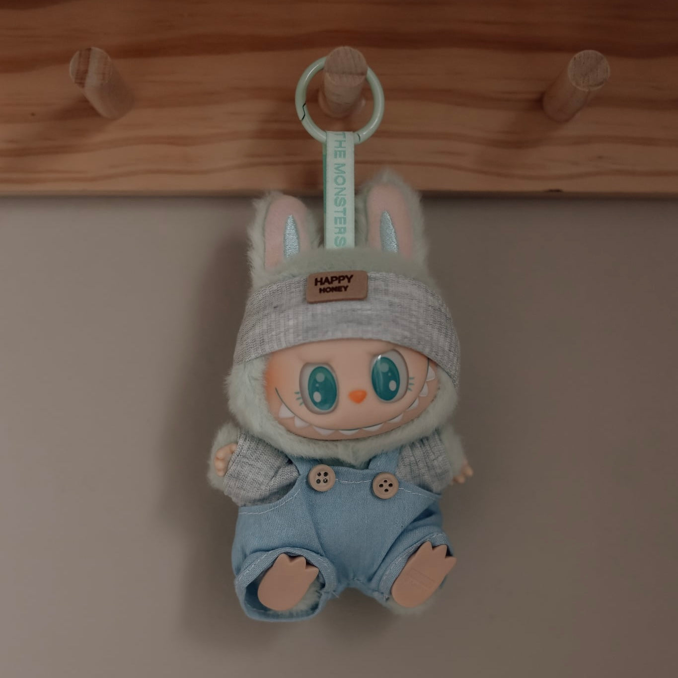Casual sæt med grå bluse, denimseler og “Happy Honey” pandebånd. Perfekt til hverdagslook og samling. Passer til Pop Mart Labubu (17 cm). Dukke medfølger ikke.