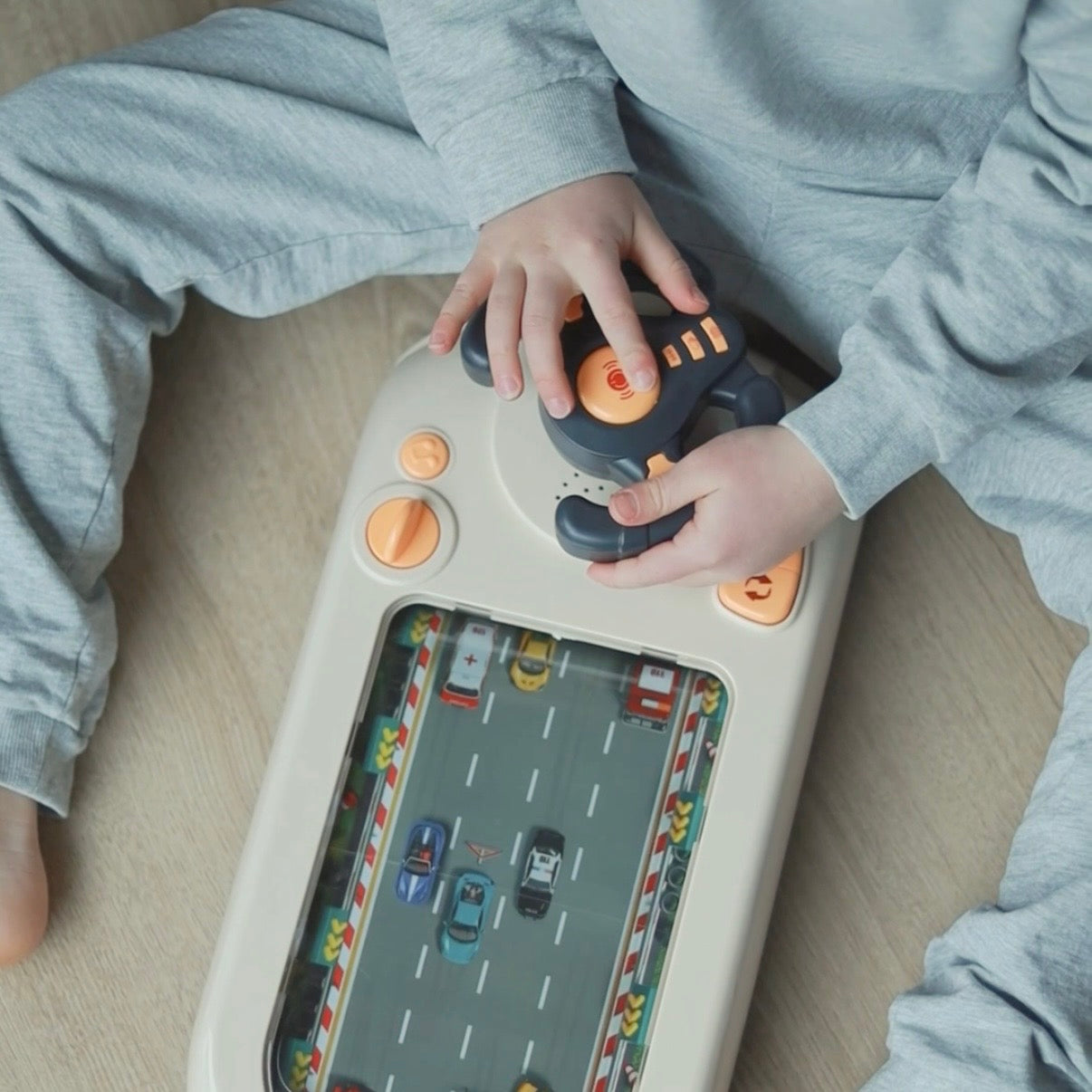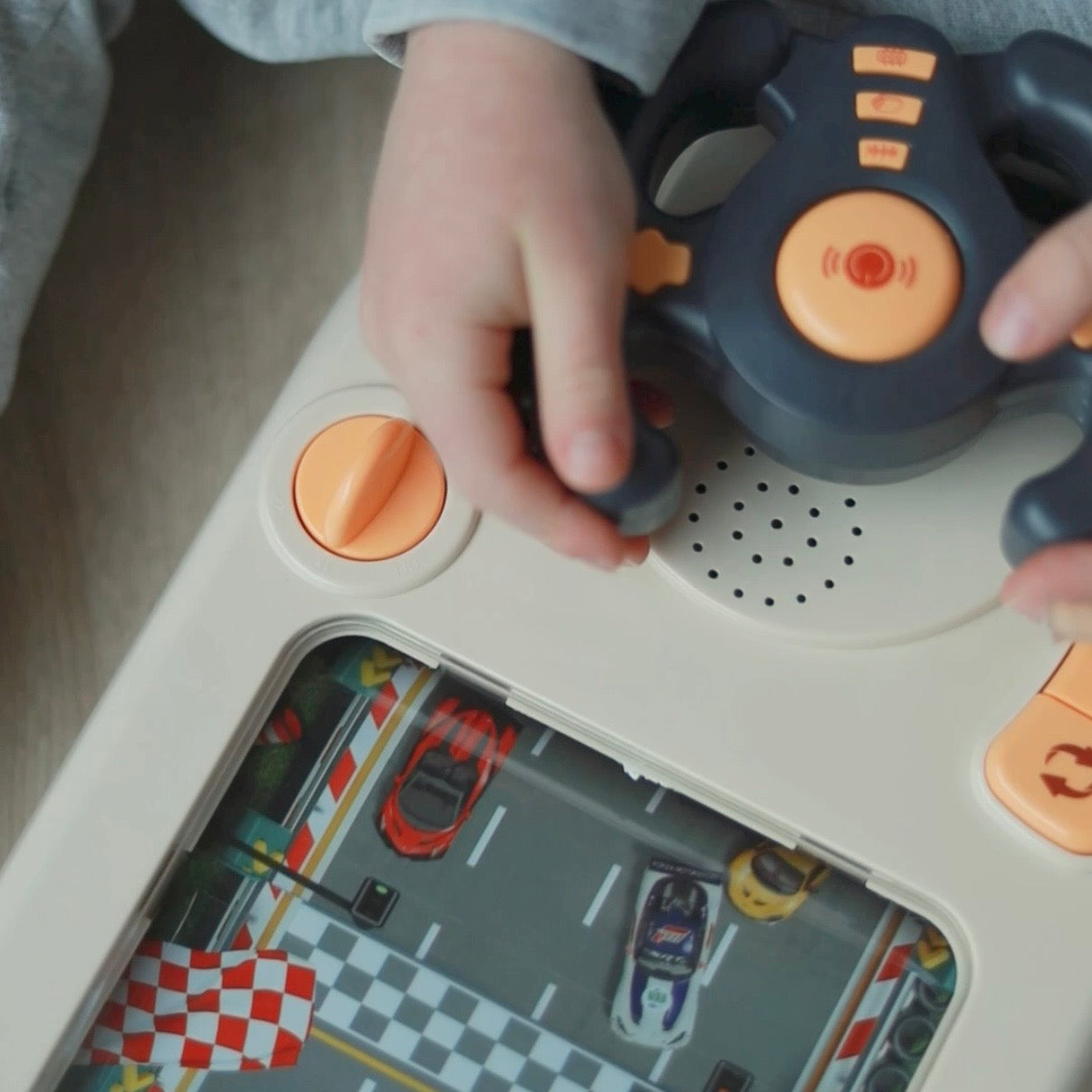 - Styr bilen på skærmen: Når barnet drejer på rattet, styrer det bilen på skærmen og skal undgå de andre biler – præcis som et rigtigt minispil.