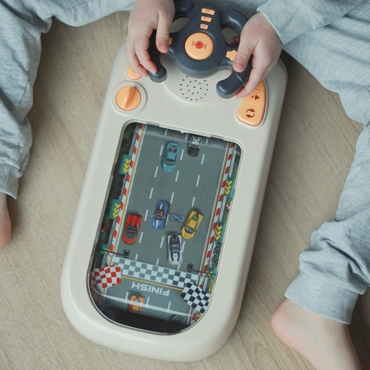 Et underholdende rat-spil, hvor barnet styrer bilen på skærmen og undgår forhindringer – ligesom i et rigtigt minispil. Legen styrker finmotorik og hånd-øje-koordination og byder på farver, lyde og masser af sjov. Fremstillet i sikre materialer og perfekt til små bilentusiaster.