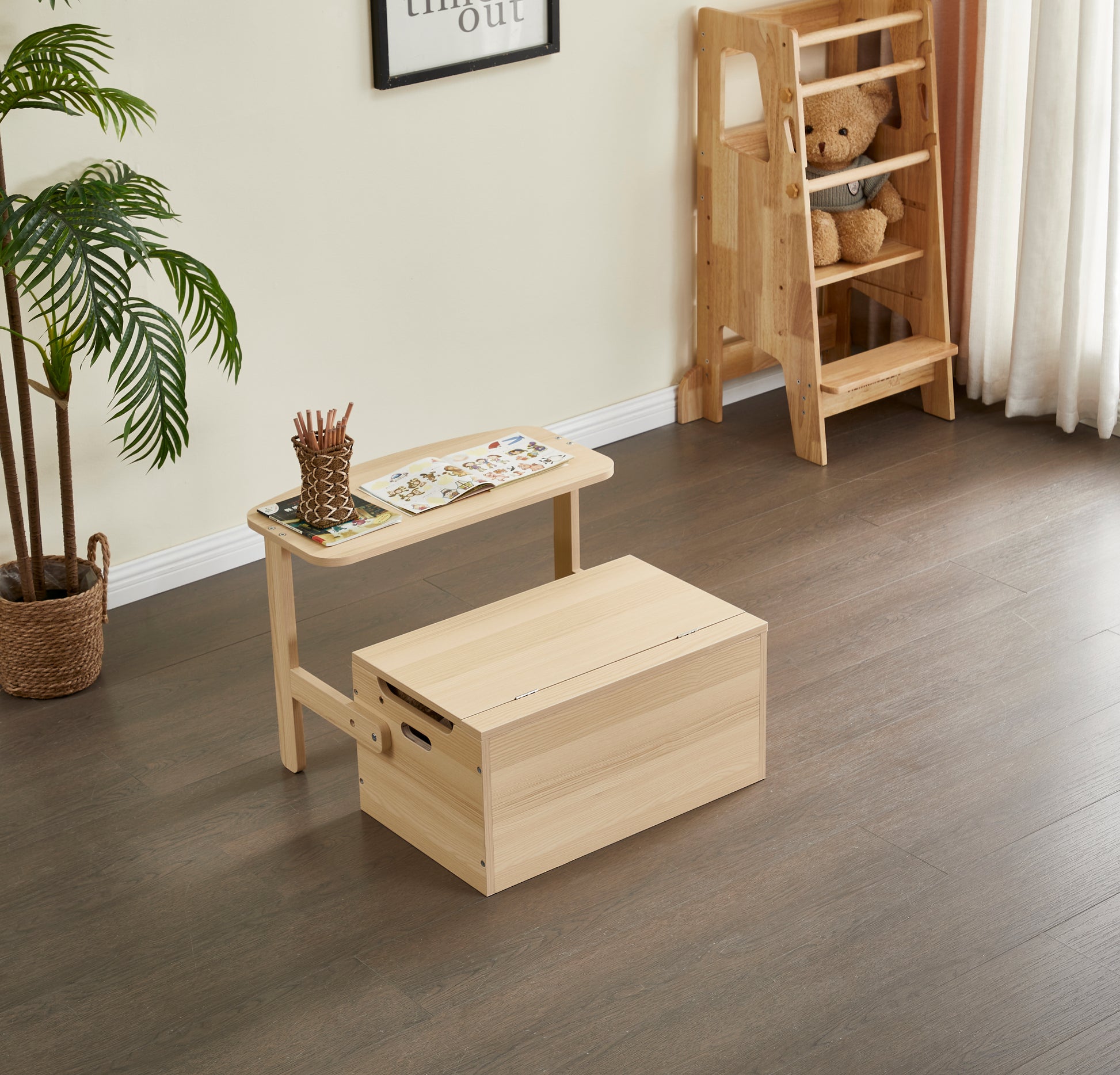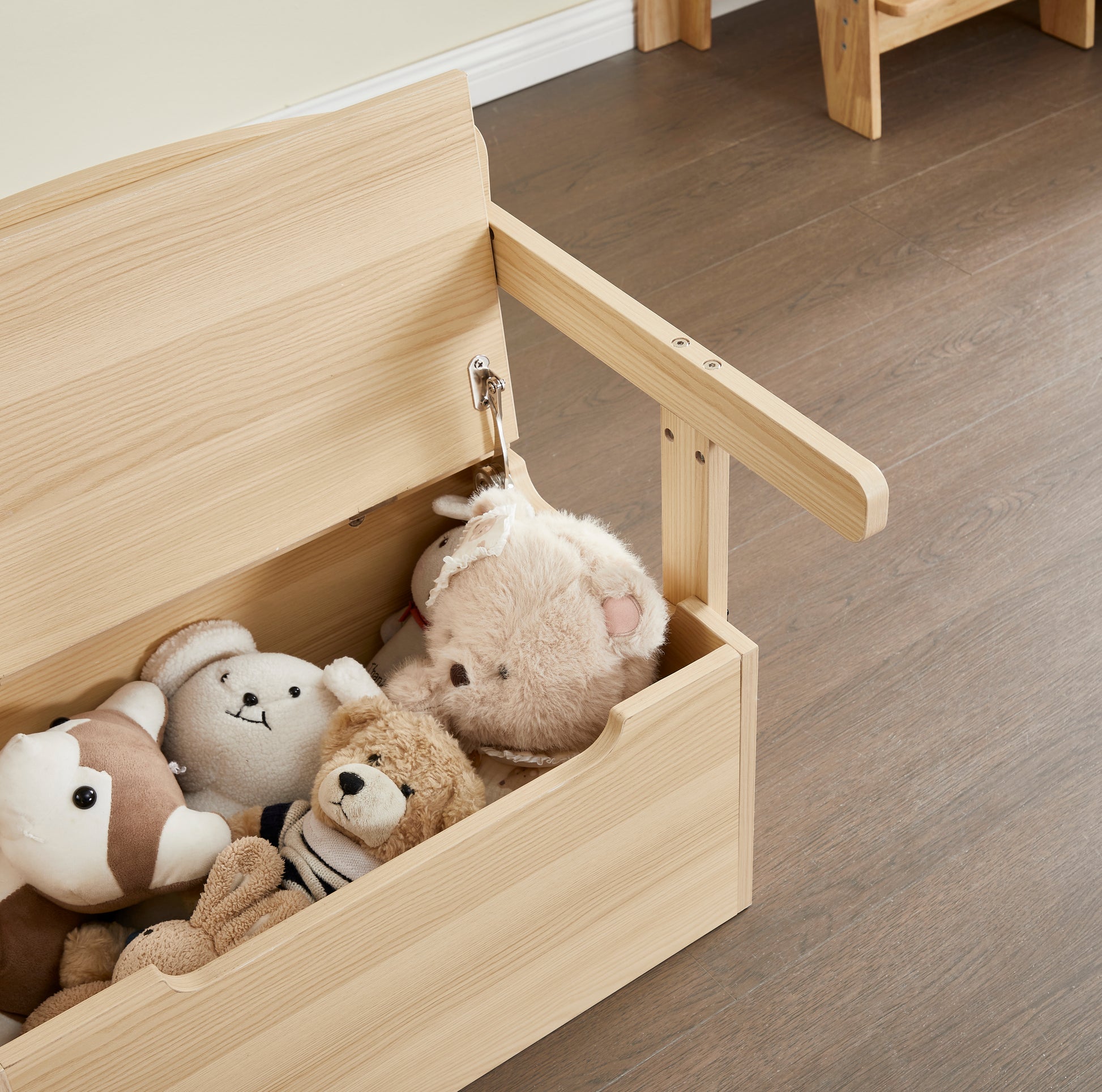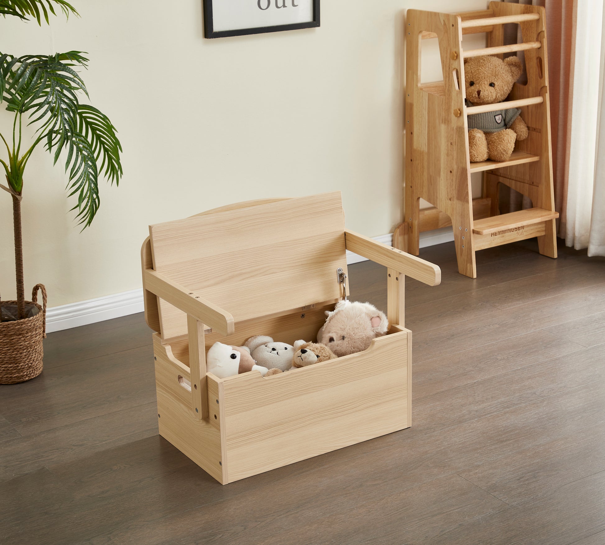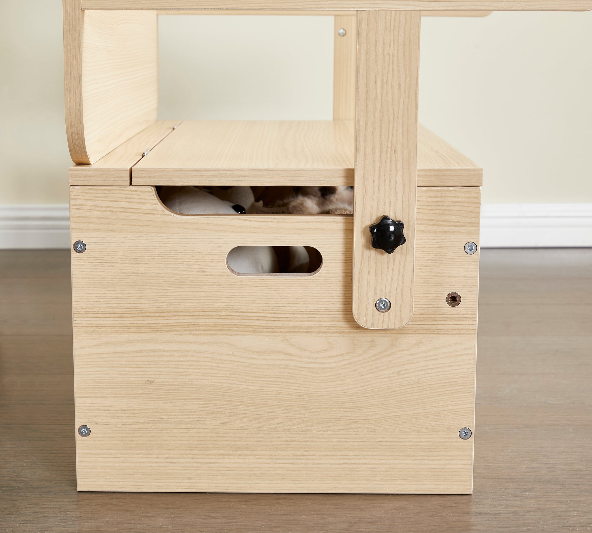 Under sædet gemmer sig et rummeligt opbevaringsrum med plads til bamser, bøger og legetøj – så værelset hurtigt kan holdes ryddeligt og roligt. Saga er designet med fokus på sikkerhed og kvalitet, og låget har en blød lukkemekanisme, så små fingre ikke kommer i klemme.