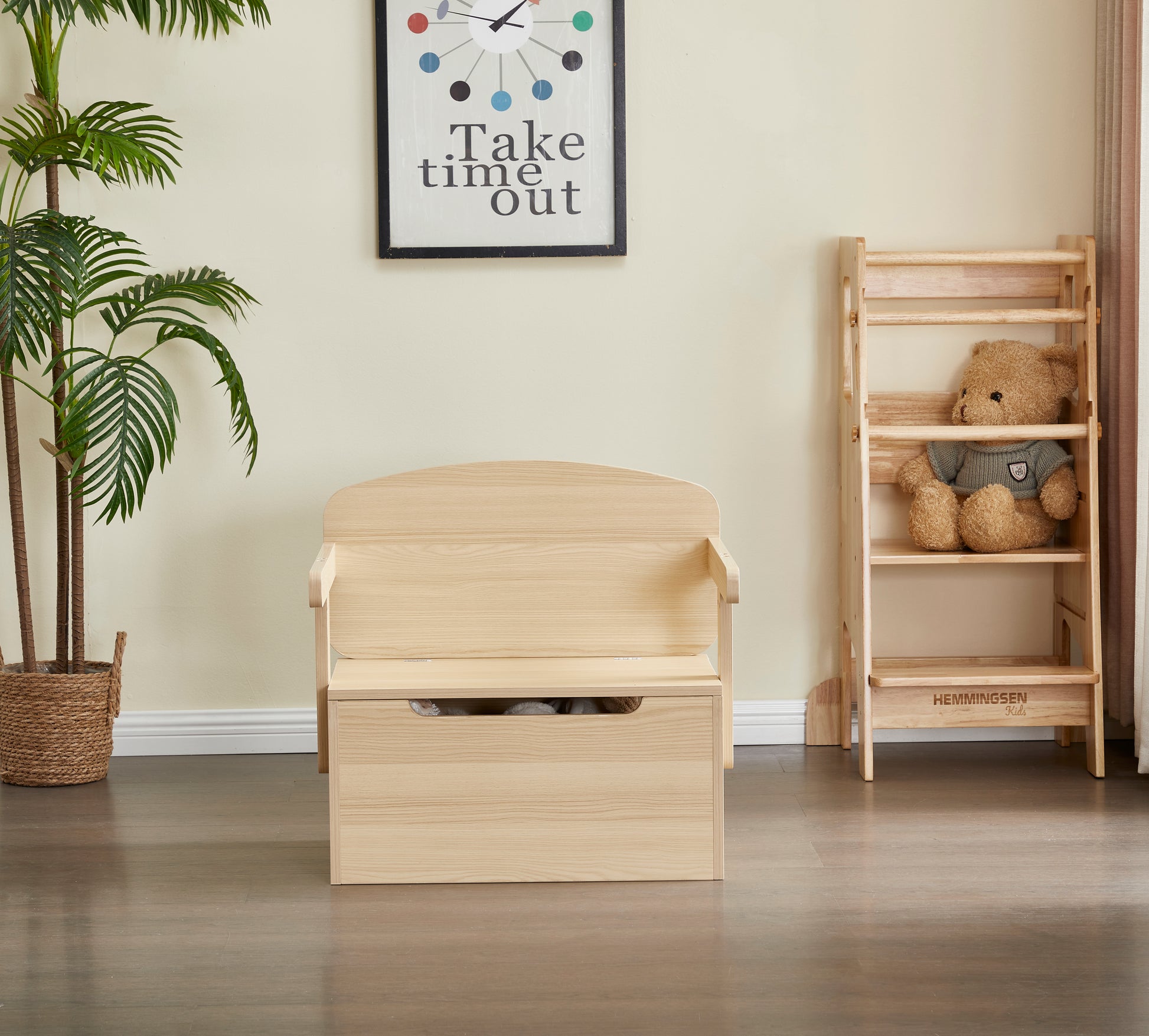 Saga Opbevaringsbænk fra Hemmingsen Kids forener leg, funktion og æstetik. Brug den som bænk, aktivitetsbord eller opbevaringsmøbel – alt i ét tidløst design, skabt i smukt naturtræ til børneværelsets rolige univers.