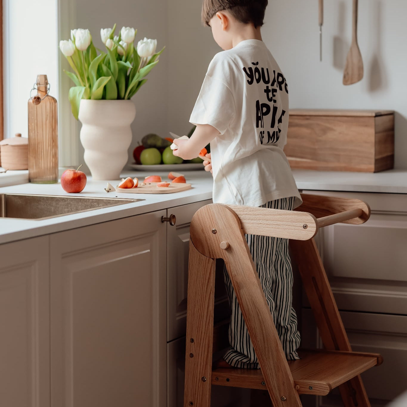 Dette innovative produkt er specielt skabt til at understøtte dit barns naturlige nysgerrighed og hjælper dem med at tage del i aktiviteter, som kun voksne tidligere kunne udføre. Ved at hæve dem sikkert op til køkkenbordsskabet eller håndvasken bliver hvert et øjeblik en læringstime, hvor de små kan eksperimentere, lære og vokse. Læringstårnets alsidige design og smukke, naturlige trælook gør det til en harmonisk tilføjelse til ethvert hjem, mens den konstruktion understøtter en bæredygtig livsstil.