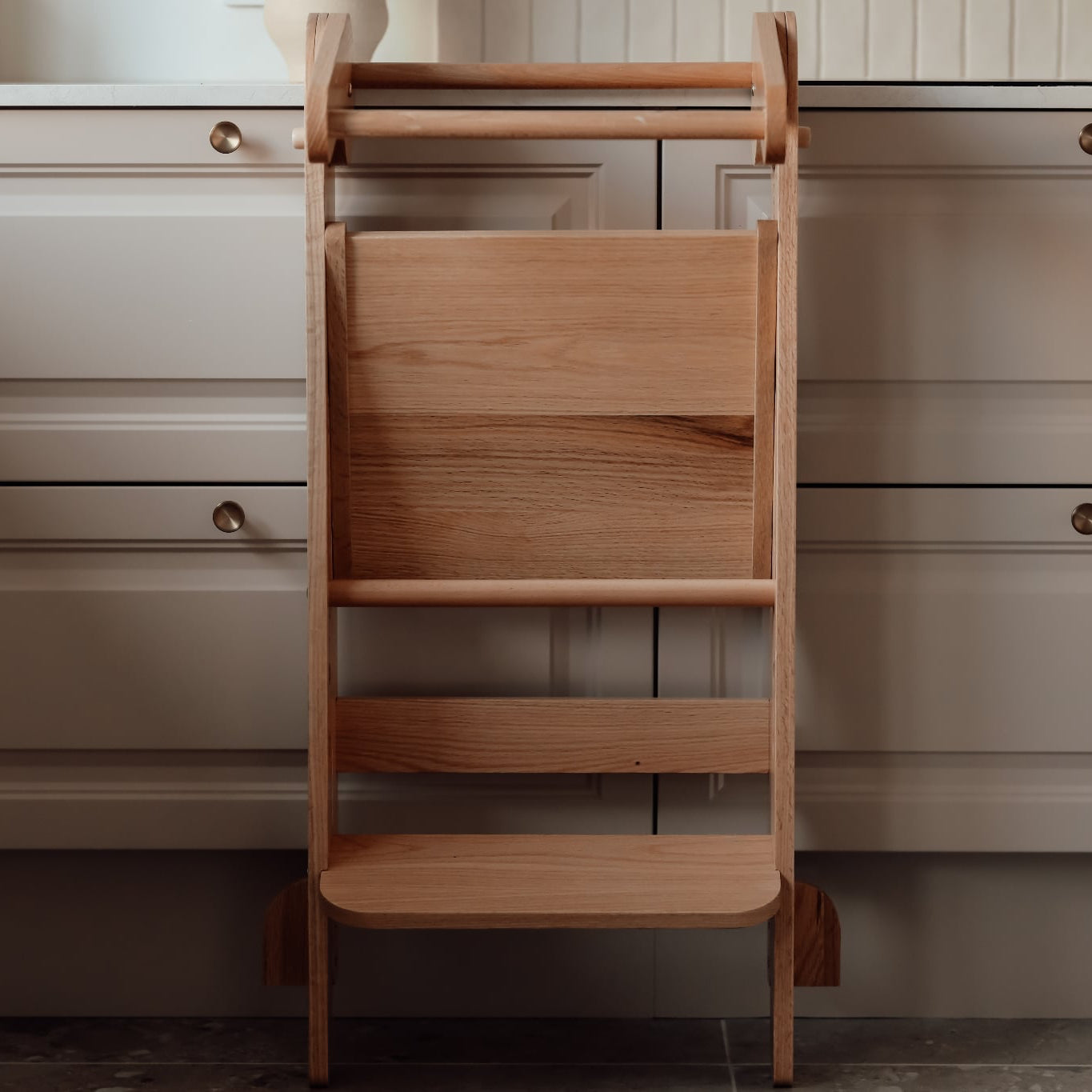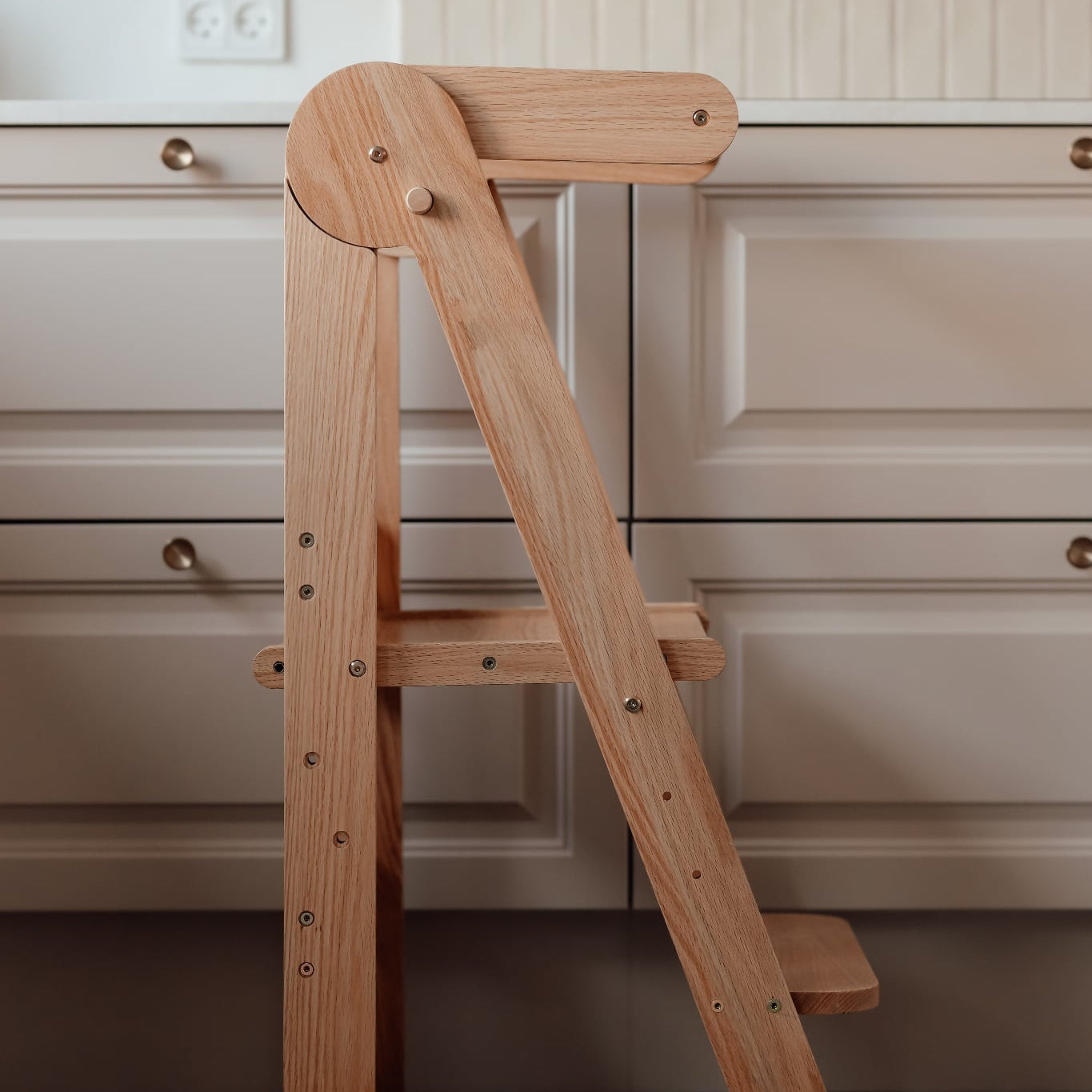 Sammenklappeligt læringstårn i træ - justerbar, stabil og pladsbesparende til leg og læring i køkkenet.