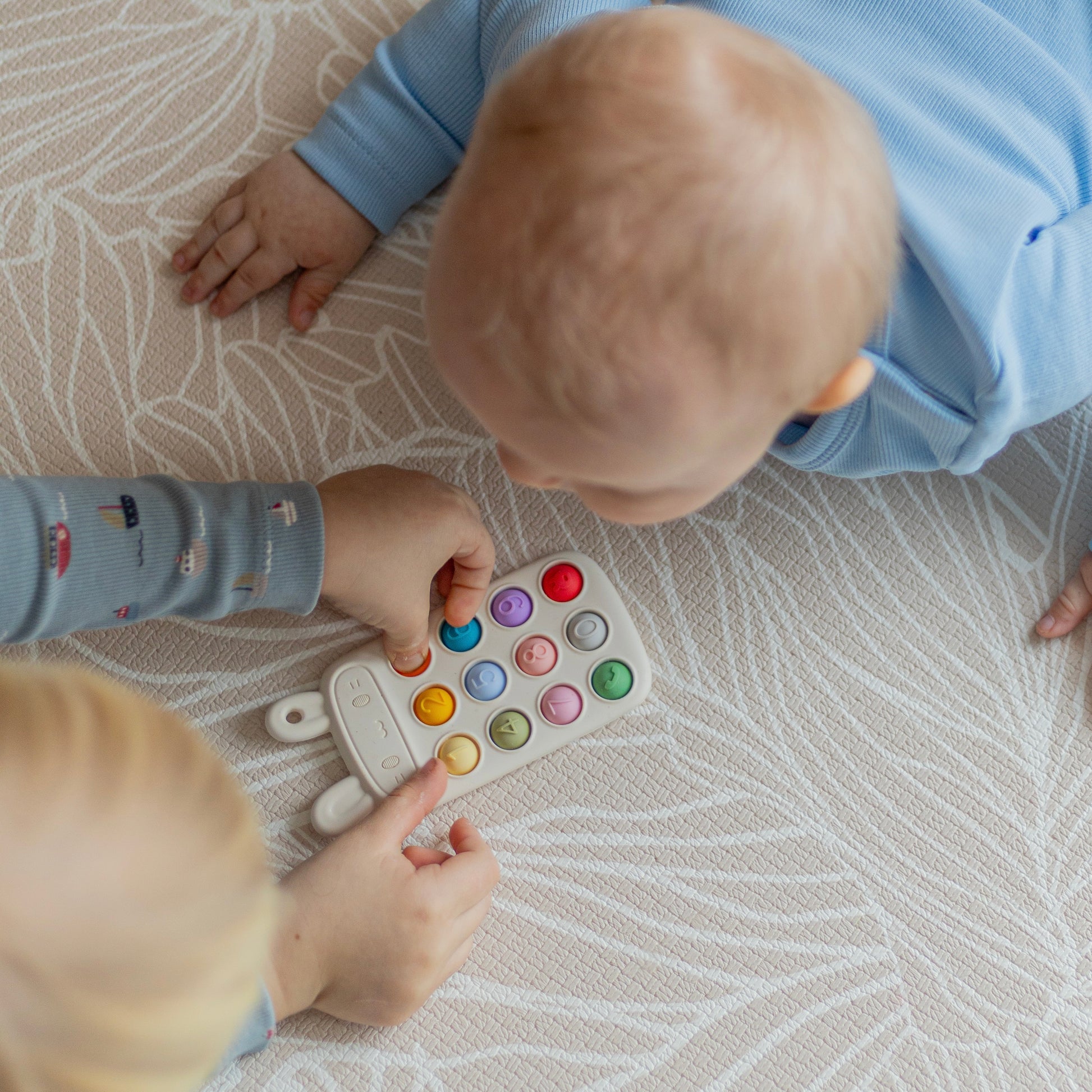Denne søde ”telefon” kombinerer pop-it funktion, blød bidering og finmotorisk træning i ét trygt og gennemtænkt design.