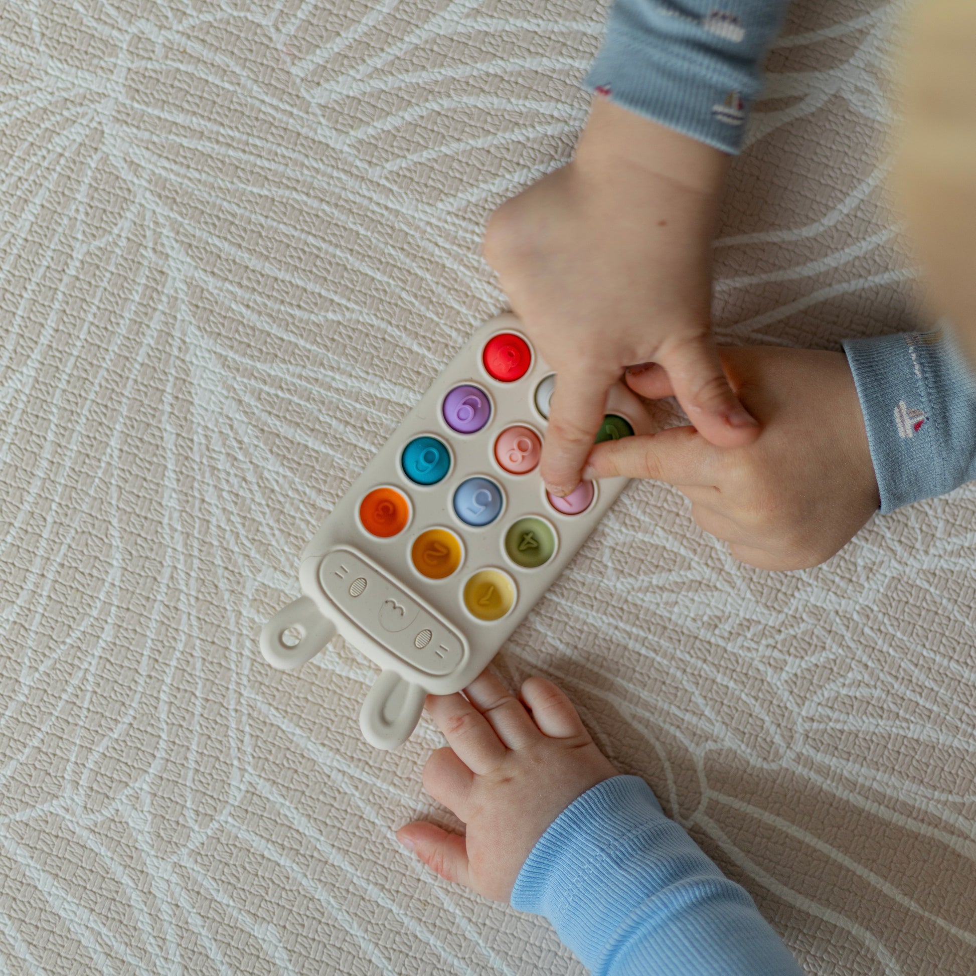 Sød silikone telefon med pop-it knapper og blød bidering – perfekt til taltræning, finmotorik og lindring ved tandfrembrud